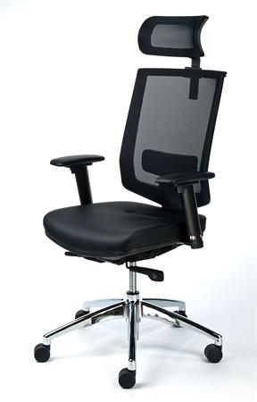 Exkluzív fejtámaszos irodai szék, fekete bőrborítás, feszített hálós háttámla, alumínium lábkereszt, MAYAH "Maxy"