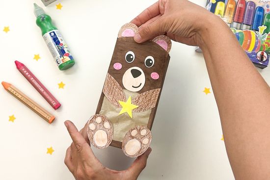 4. Amint megszáradt a festék a dobozon, helyezzük a bézs selyempapírt tejesdoboz belsejébe, majd ragasszuk fel a maci testrészeit és a csillagot a dobozra.