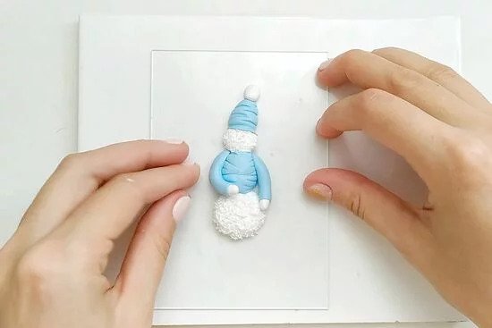 3. A hóember sapkáját is fedjük le FIMO pasztellvíz színű gyurmával és vágjuk le a felesleget. A tű hegyével pedig készítsük el a pulóver és a sapka mintázatát.