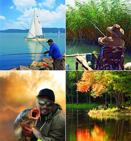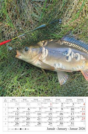 -naptár rész: magyar, angol, német nyelven, magyar  ünnepek  és névnapokkal, napkelte, napnyugta és holdállás  feltüntetésével