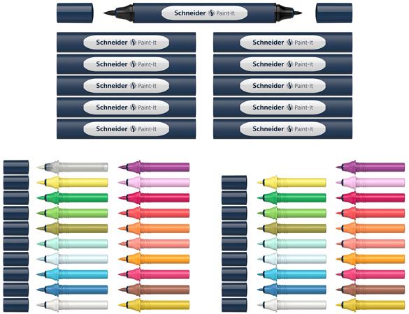 Kétvégű marker készlet, 52 darabos, SCHNEIDER "Paint-It 040 Twin marker Set 1", 20 különböző szín