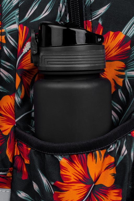 Két oldalán vizes palackok tárolására alkalmas zsebek találhatók.