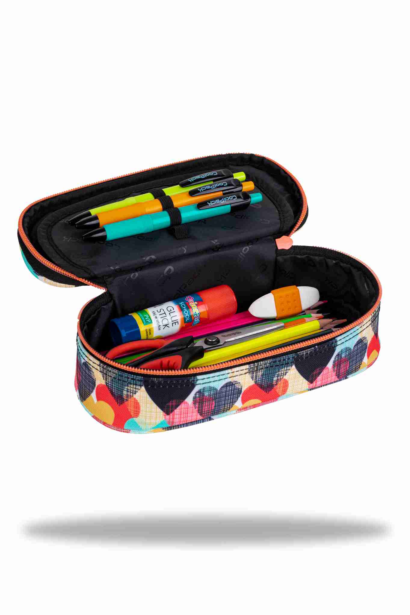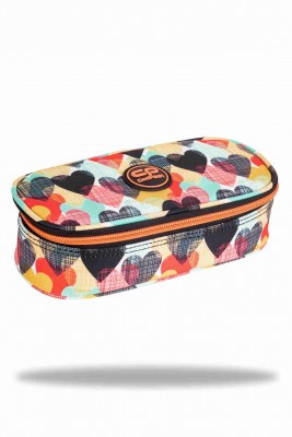 • Cool Pack márkájú üres, ovális formájú cipzáras tolltartó, közepén klapnival, amelynek két oldalán 5-5db gumipánt található, alatta egyterű rekesszel.