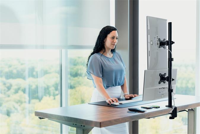 A Vertical Stacking Dual Monitor Arm két monitor stabil és biztonságos függőleges elhelyezését kínálja.