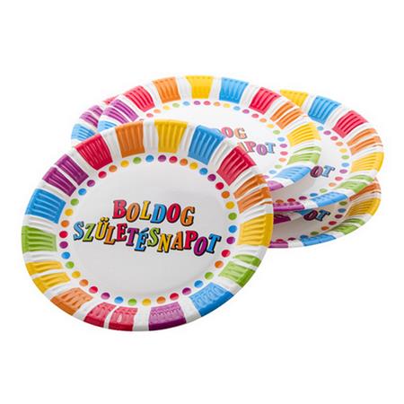 Tányér, papír, 23 cm, "Boldog születésnapot", csíkos-pöttyös