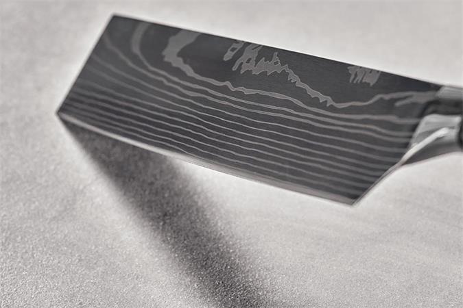 -lézergravírozott, damaszkuszi acélra stilizált penge