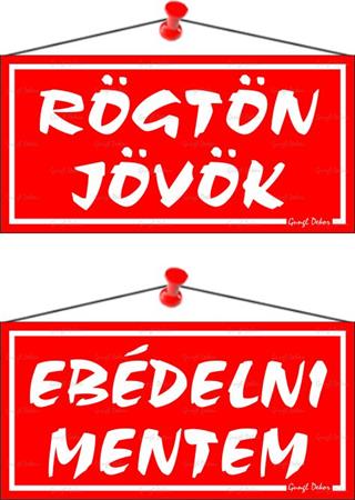 Információs tábla, 20x10,5 cm, kétoldalas, "Rögtön jövök/Ebédelni mentem", piros